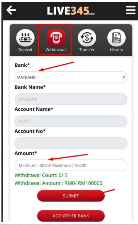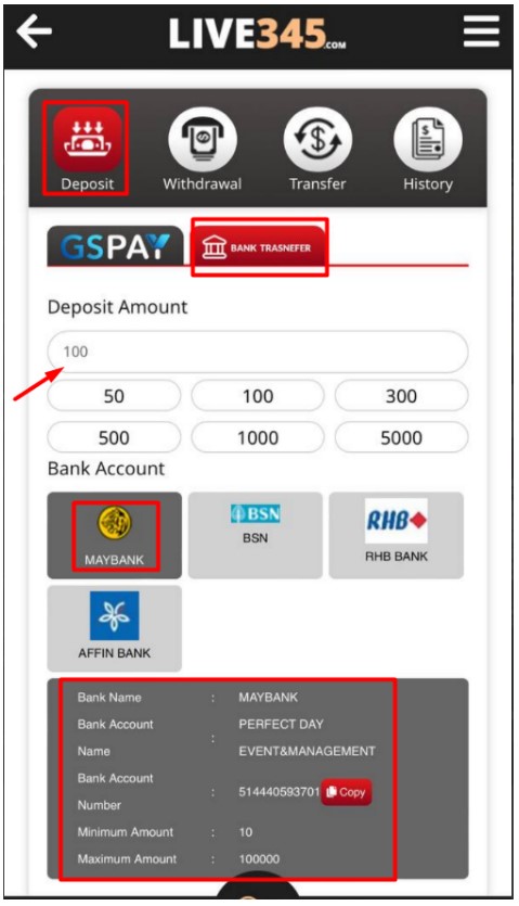 Insert the amount that you have deposit into one of our banks at DEPOSIT AMOUNT, and click on the bank that you have deposit at BANK ACCOUNT.